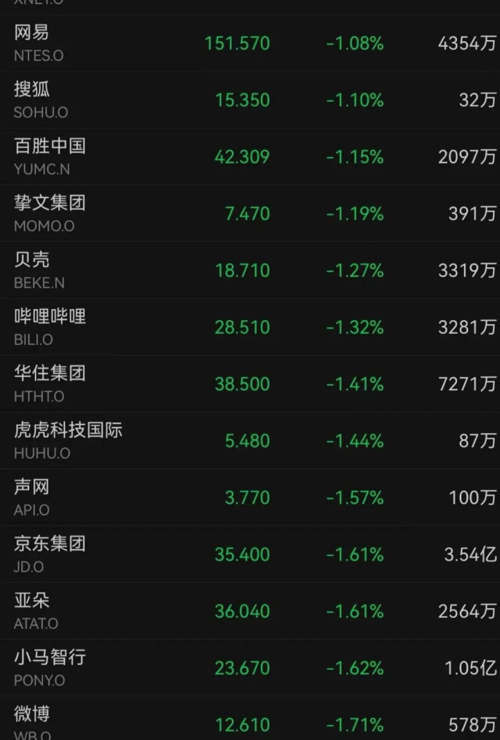蔚来、小鹏汽车、理想汽车分别下跌2.66%、3.09%、3.99%。文远知行、网易、哔哩哔哩等分别下跌2.66、1.08%、1.32%。