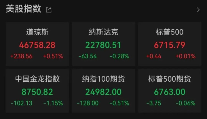 截至收盘,道琼斯指数上涨0.51%,报46758.28点;标普500指数上涨0.01%,报6715.79点;纳斯达克指数下跌0.28%,报22780.51点。