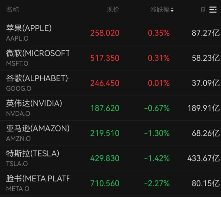 截至收盘,英伟达下跌0.67%,亚马逊、特斯拉和脸书分别下跌1.30%、1.42%、2.27%。苹果、微软和谷歌分别收涨0.35%、0.31%、0.01%。
