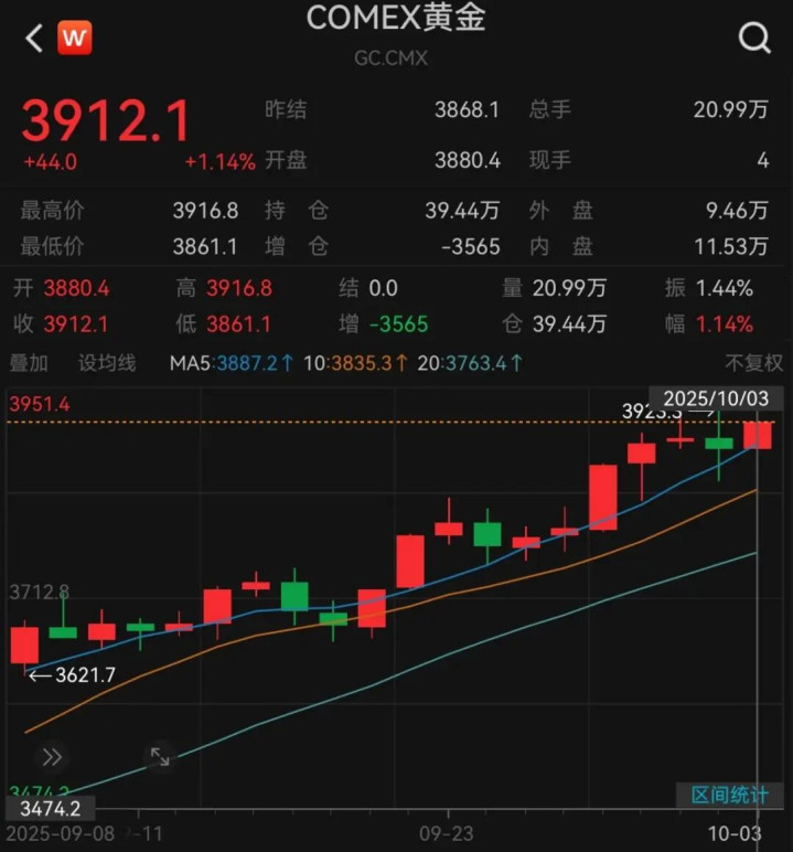 国际金价再度走高。COMEX黄金收涨1.14%,报收于3912.1美元/盎司。